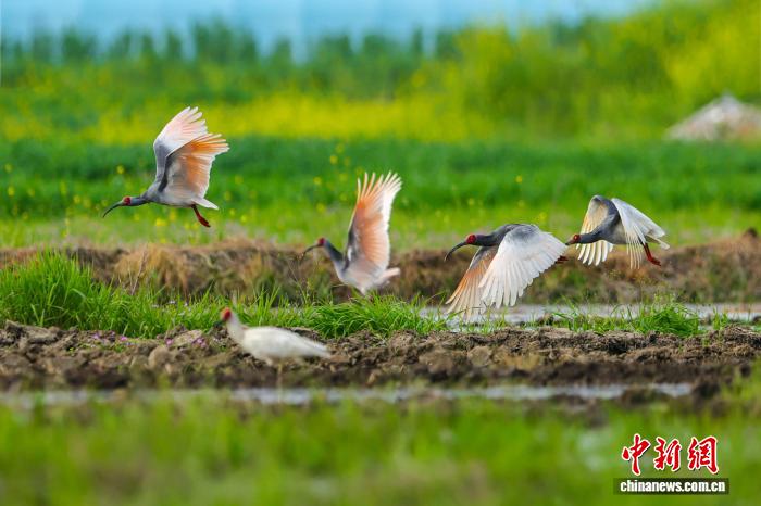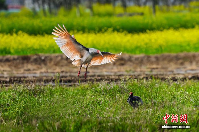 不日,天处秦岭要地的陕西汉中乡固县火稻育秧正闲,墨鹮正在田间穿越,矮飞寻食,组成1幅天然战谐的原野好景。图为墨鹮取油菜花“共框”。 李凶安 摄